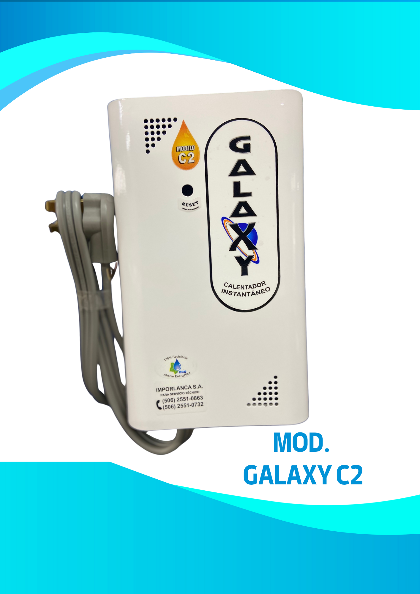 Galaxy C2: Calentador de potencia fija que ahorra energia, pues recorta si entra poca agua, es durable, y grado alimenticio.
